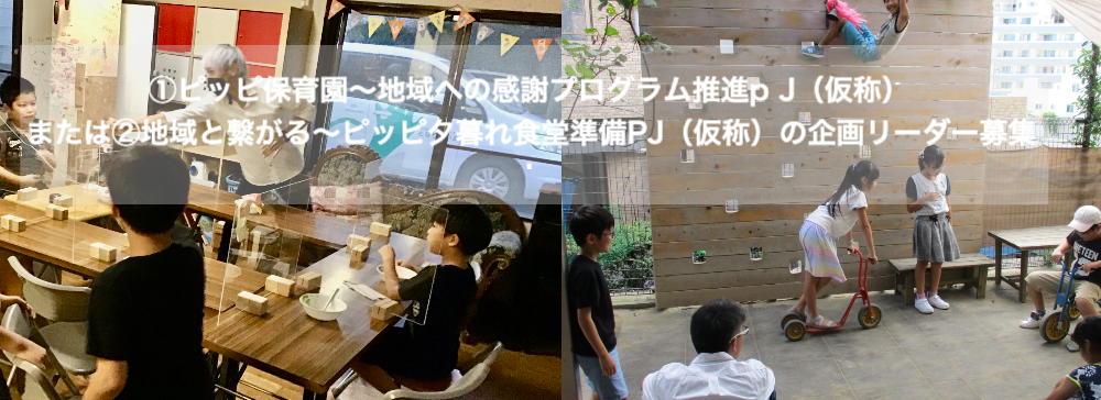 ①ピッピ保育園〜地域への感謝プログラム推進p J(仮称)または②地域と繋がる〜ピッピ夕暮れ食堂準備PJ(仮称)の計画を準備段階から関わり、企画立案・広報ツールの作成に関わるスタッフを募集します。